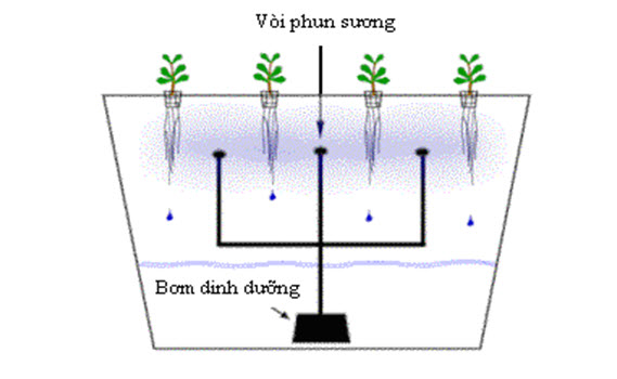 Cây trồng trong nhà lưới được khí canh với kỹ thuật cố định trong các lỗ trên các tấm xốp và rễ được treo trong không khí dưới các tấm xốp này. Các tấm này được xếp thành các hộp kín để ngăn sự xâm nhập của ánh sáng và kích thích sự tăng trưởng của rễ, đồng thời ngăn sự tăng trưởng của tảo, nấm. Dung dịch dinh dưỡng được phun vào rễ dưới dạng sương mù, mỗi lần phun kéo dài khoảng vài giây, cứ mỗi 2 – 3 phút lại phun một lần. Làm như vậy có tác dụng giữ ẩm cho rễ và dịch dinh dưỡng được thoáng khí. Cây hấp thu chất dinh dưỡng và nước từ lớp dung dịch bám vào rễ.