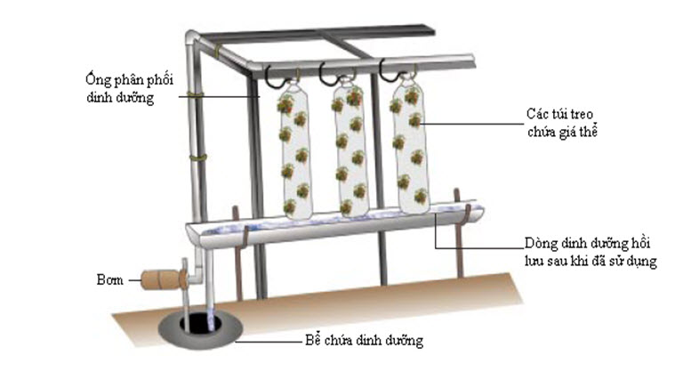 Hình minh họa kỹ thuật thủy canh trong nhà lưới có sử dụng giá thể rắn bằng kỹ thuật túi treo