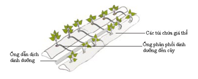 Hình minh họa kỹ thuật thủy canh trong nhà lưới có sử dụng giá thể rắn bằng kỹ thuật túi tăng trưởng