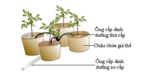 Hình minh họa kỹ thuật thủy canh trong nhà lưới có sử dụng giá thể rắn bằng kỹ thuật chậu