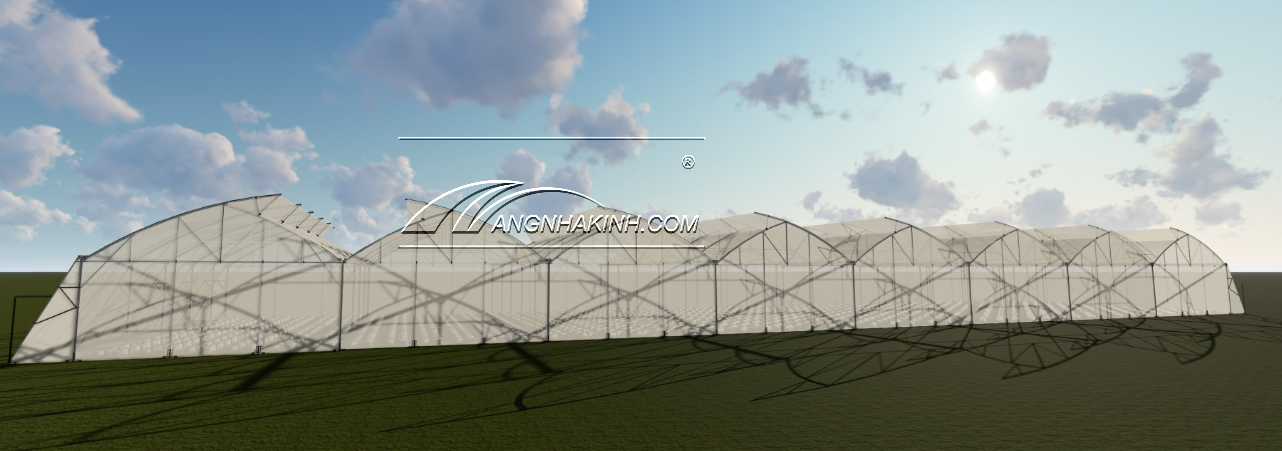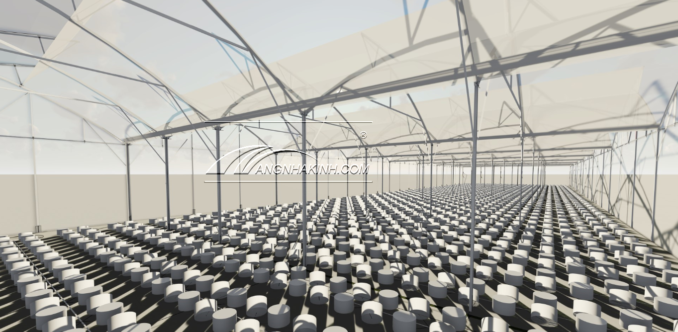 - Nhà màng được thiết kế với nhiều kiểu khác nhau, tuy nhiên cần đảm bảo các điều kiện như: độ truyền sáng từ 85 - 90%; quy cách: độ cao cột (chiều cao từ mặt đất đến máng xối) từ 4 - 4.5 hoặc 5m, khẩu độ mỗi gian nhà là 9,6 m, cột cách cột (bước cột) là 4m. Với mái được lợp bằng màng Polymer (dày 150 micron) và vách xung quanh được che bằng lưới chắn côn trùng với quy cách 50 mesh. Thồng thường ở khí hậu như miền Nam thì nhaluoi.net sử dụng loại lưới chống côn trùng được sản xuất riêng phù hợp với thời tiết.