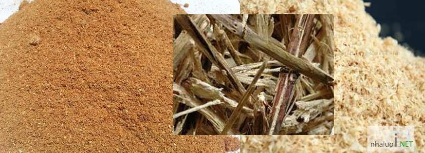 Hinh hoạ nguyên liệu mùn cưa, bã mía cho trồng nấm trong nhà kính nhà lưới.